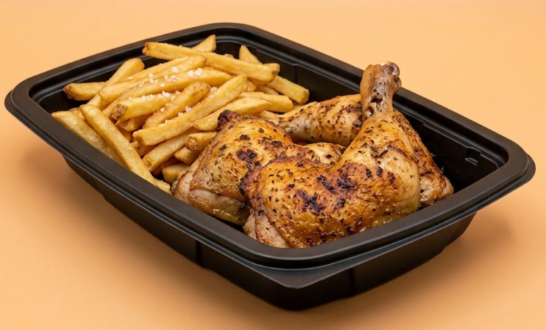 includes: 3 Baked Chicken Leg Quarters, served with French Fries
